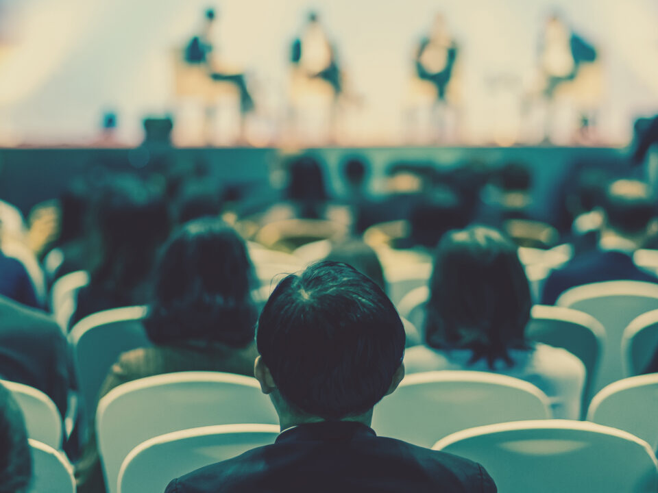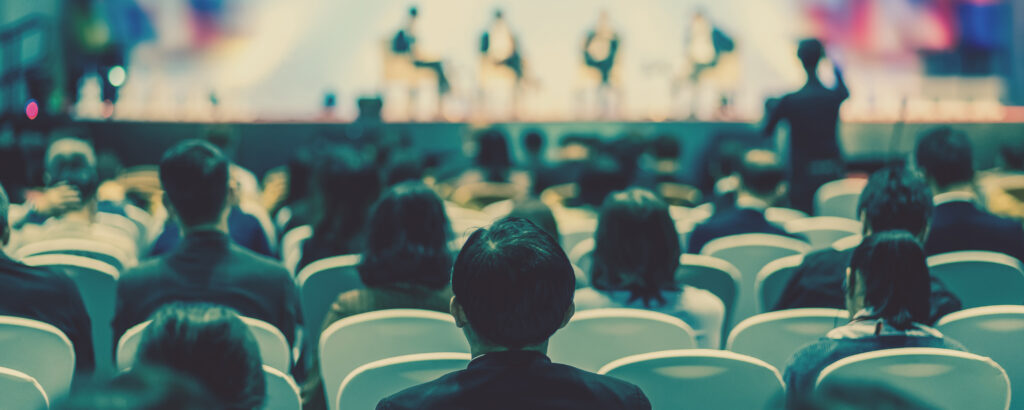 Banner cover page of Rear view of Audience listening Speakers on the stage in the conference hall or seminar meeting, business and education about investment concept